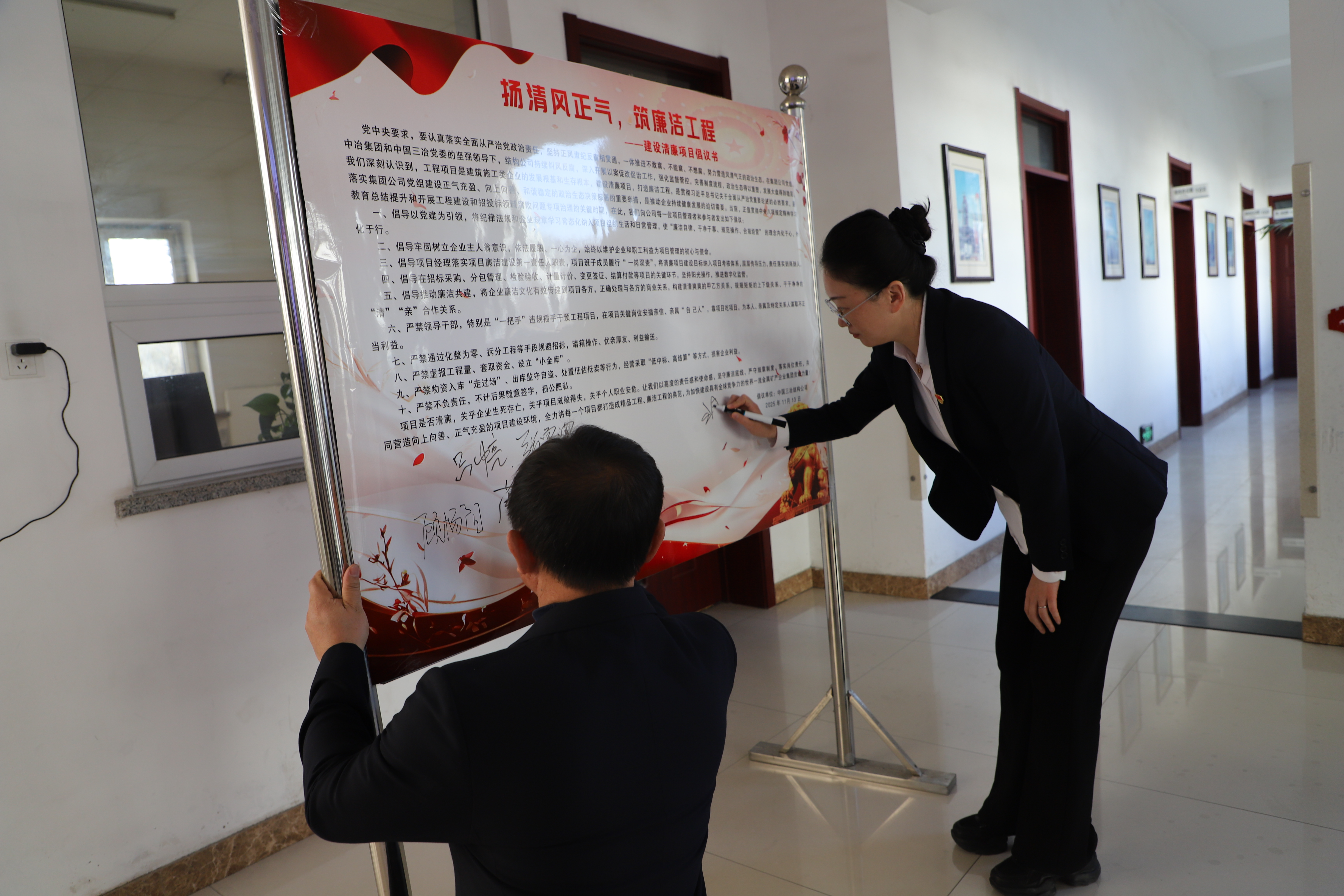 《建設(shè)清廉項目倡議書》聚焦項目建設(shè)中“權(quán)力集中、資金密集、資源富集”等關(guān)鍵領(lǐng)域,精準謀劃制定“雙五條”條款。其中,5條倡導(dǎo)性條款清晰明確地給出了“主動接受監(jiān)督、規(guī)范權(quán)力運行、堅守廉潔底線、弘揚清風(fēng)正氣、爭做廉潔表率”的行動指南;5條禁止性條款以“嚴禁利益輸送、嚴禁吃拿卡要、嚴禁違規(guī)決策、嚴禁虛報冒領(lǐng)、嚴禁失職瀆職”為核心主旨,為項目建設(shè)劃定了不可逾越的紅線與底線。這一“倡導(dǎo)+禁止”的雙重約束體系,既為干部職工提供了清晰明確的行為準則,也為項目廉潔風(fēng)險防控筑牢了堅不可摧的“安全屏障”。